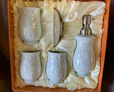 5-piece set, that includes: soap dispenser, soap holder, 2 cups and one toothbrush holder